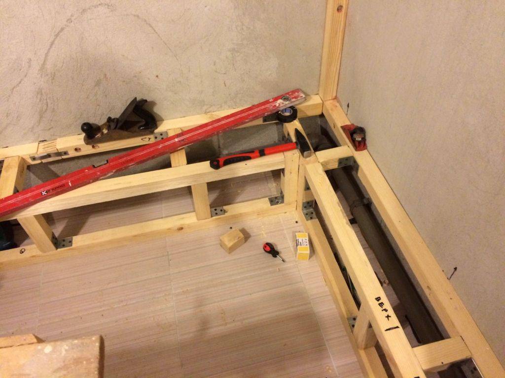 Установив каркас, монтируем три качественно отшлифованных наждаком щита. Соединяем их мебельными уголками, проложив стыки резиновыми полосками. После этого устанавливаем щит, в котором находится дверной проем и в последнюю очередь потолочный.