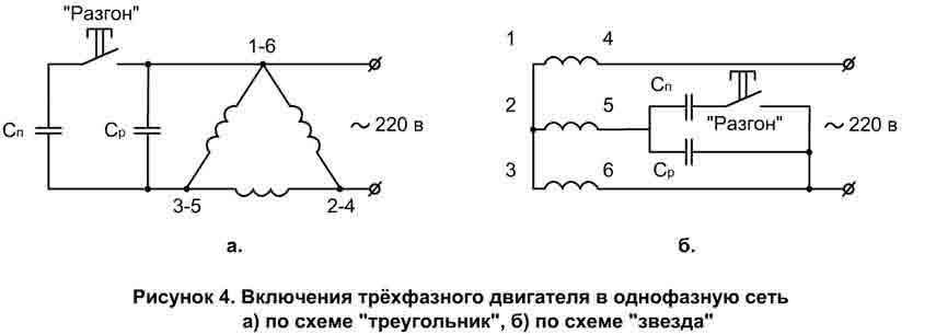 Если двигатель на одно напряжение, то вывода будет три, а остальные выводы расключены и находятся внутри двигателя. То есть начало первой обмотки над концом третьей, начало второй концом первой и начало третьей над концом второй. Главное, чтобы, как уже говорилось выше, рабочее напряжение их не было меньше в. Чтобы подключить ЭД на В с помощью конденсаторов, действуйте следующим образом: Соедините емкости между собой как упоминалось выше, соединение должно быть параллельным. С конденсатором дополнительная упрощенная — для схемы треугольник.