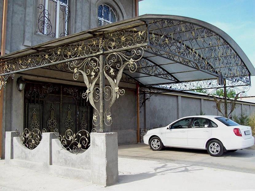 Металлические навесы можно украсить ковкой – очень красиво смотрится, хоть и дорого. Ее приваривают , как правило, на верхней обвязке и в углах между опорами и планкой обвязки. Если позволяют финансовые средства, можно украсить фасад коваными изделиями, заделав ими все углы.