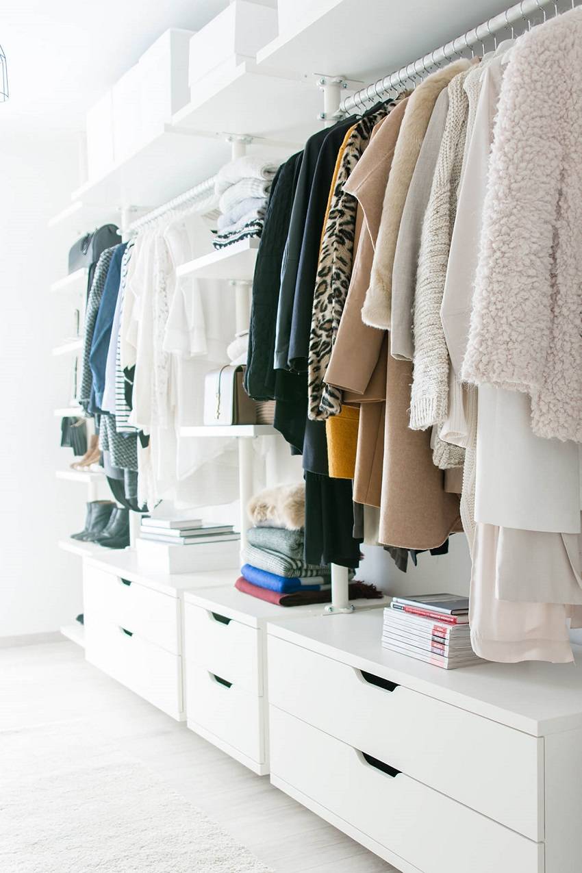Если вы разрабатываете проект для воплощения своими руками, учитываете и возможность приобретения различных кофров, кейсов и корзин для хранения. Они вполне заменят функцию выдвижных ящиков и при этом помогут достигнуть оптимального порядка внутри гардеробной.