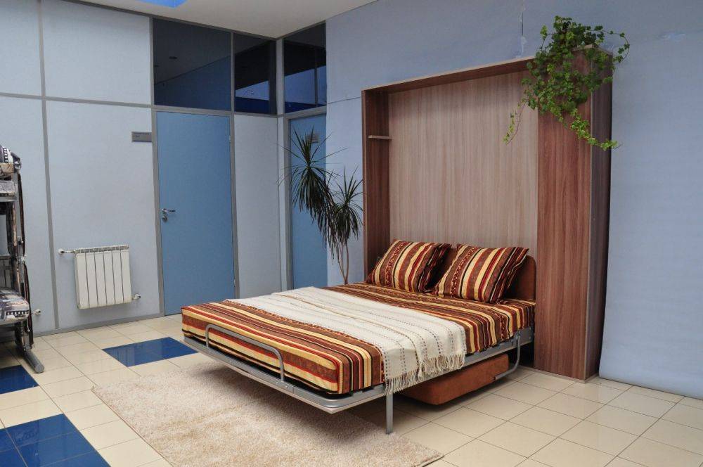 - подъемные кровати, примыкающие к перегородке боковой частью, занимают много места в собранном состоянии, но компактны при раскладывании. Также существует возможность установки над ними встраиваемых полок — это плюс.