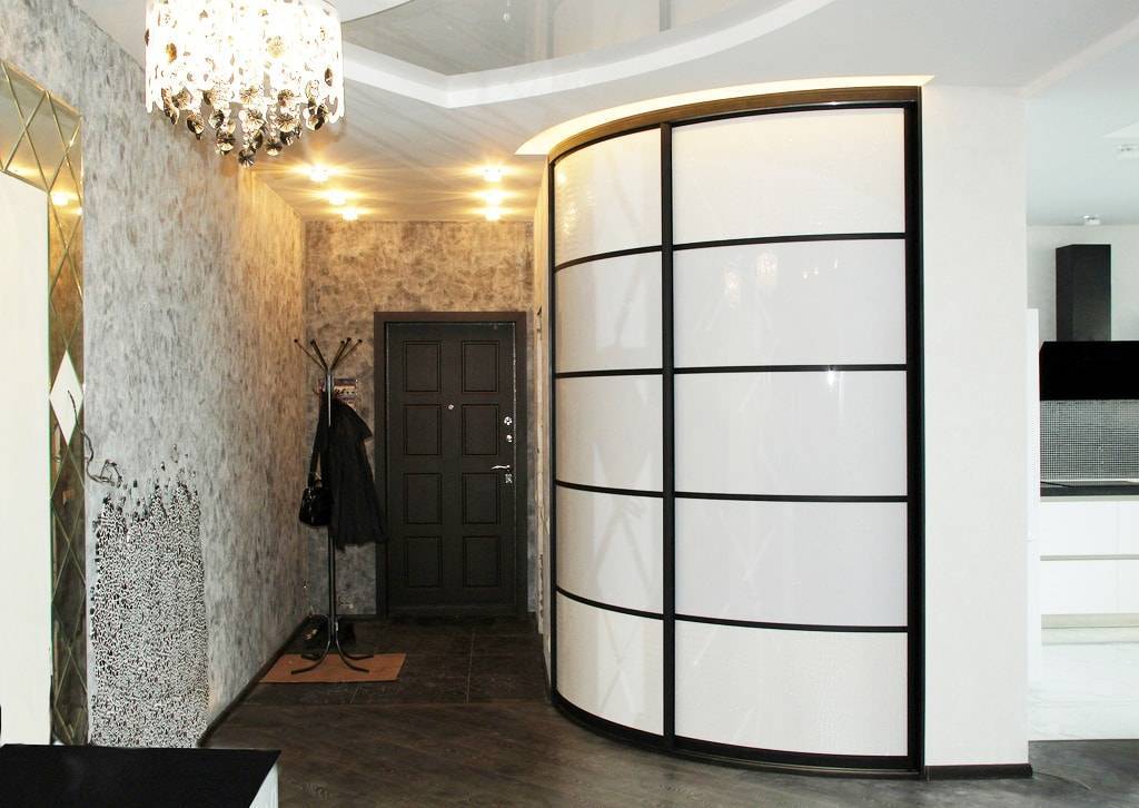 Радиусные шкафы выглядят оригинально и непривычно. Они бывают вогнутыми, выпуклыми, комбинированными (волнообразными), круглыми и угловыми. Благодаря разнообразию форм, есть возможность выбрать радиусную модель для помещения любой площади и конфигурации. Например, угловой вариант лучше всего будет смотреться в небольшом помещении, а вогнутая или выпуклая модель в углу просторной прихожей. Эффектно выглядит волнообразный шкаф.