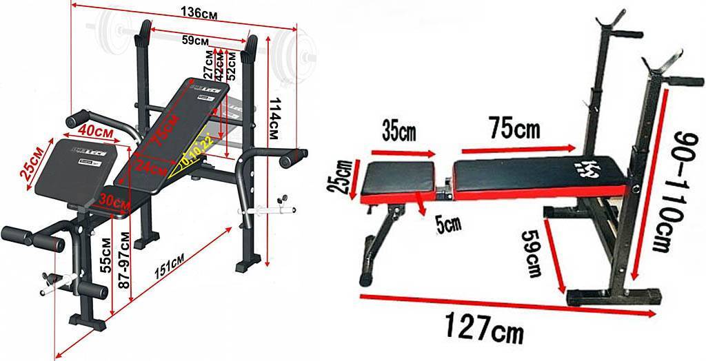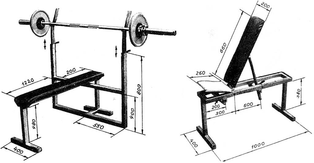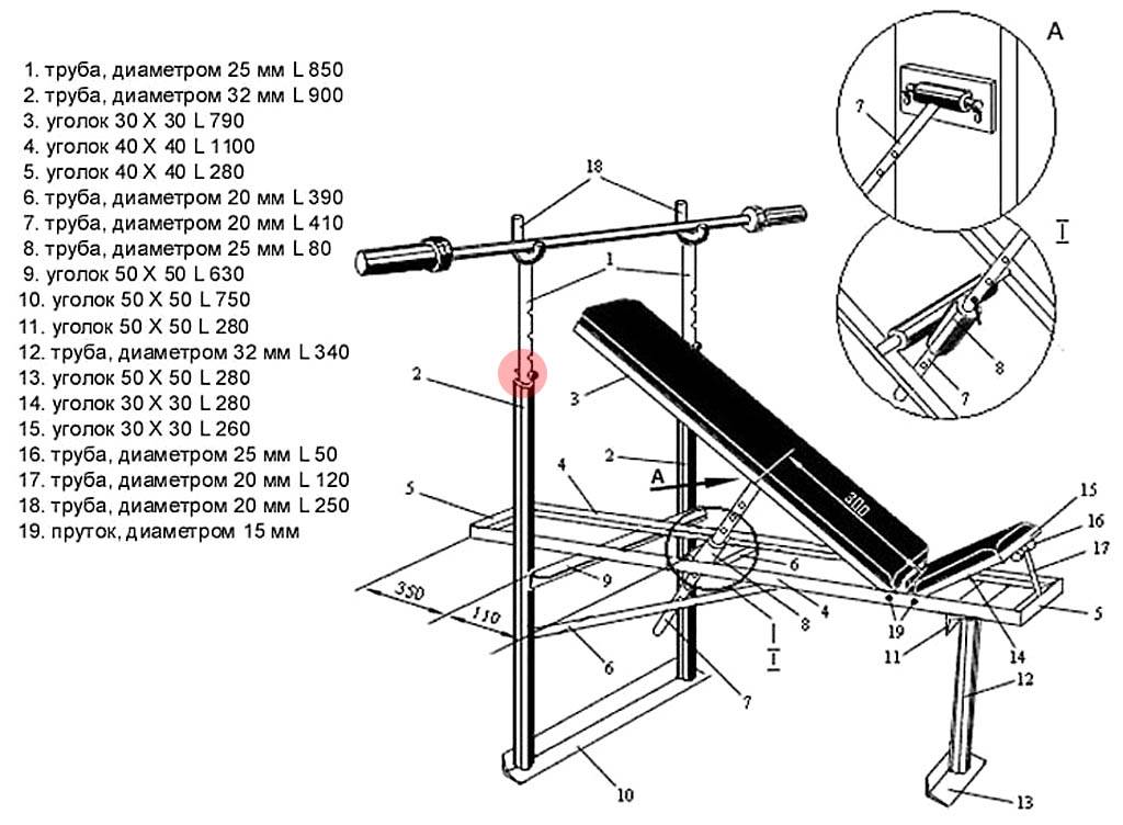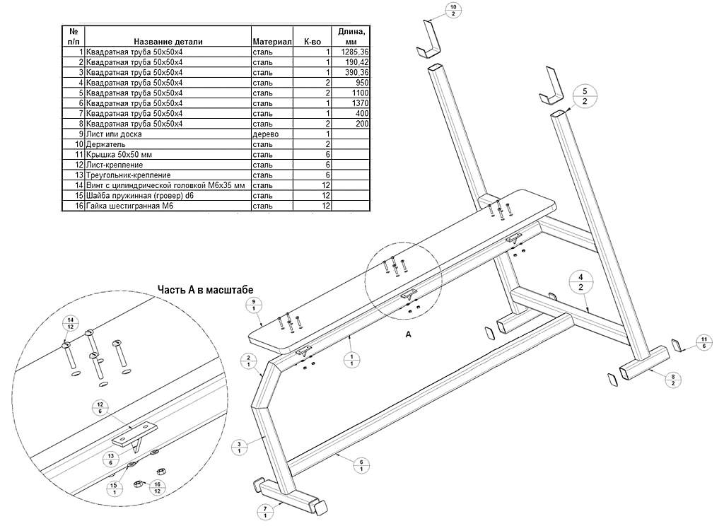 Трубы свариваются в единую конструкцию согласно чертежам. Из ДСП вырезается прямоугольная силовая скамья, обклеивается поролоном и обтягивается материей. Силовая скамья может изготавливаться и из досок. Главное — качественное и удобное покрытие. Ведь деревянная скамья менее прочна и ее советуют только для начинающих.