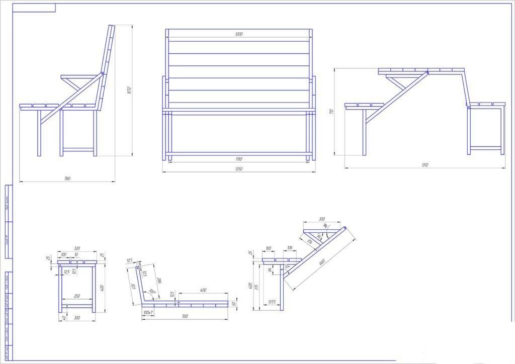 Перед тем как начинать сооружать скамейку — трансформер необходимо подготовить все материалы и инструменты, а также составить хороший чертёж или найти его в интернете.