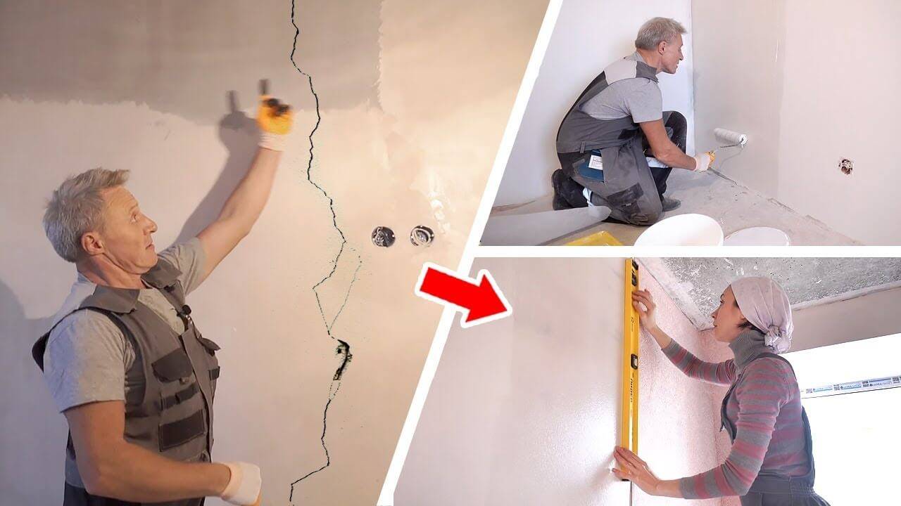 - заделать все дефекты (ямки, трещины и др.) с помощью штукатурки с последующим выравниванием шпаклевкой;