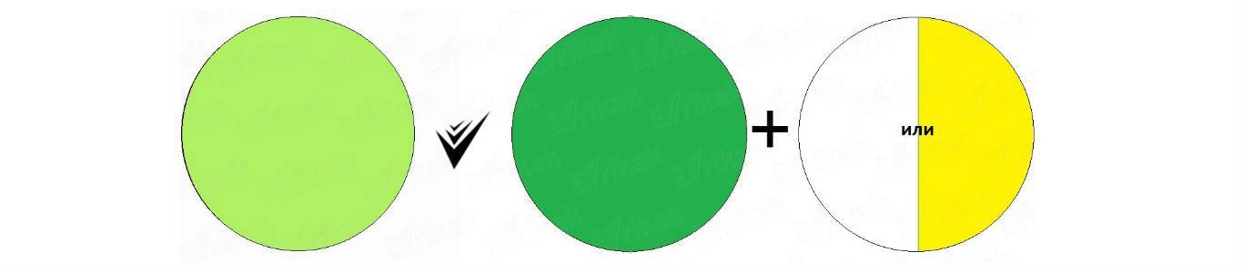 Желто-зеленый эффект получится при комбинировании желтого с синим в соотношении 2:1