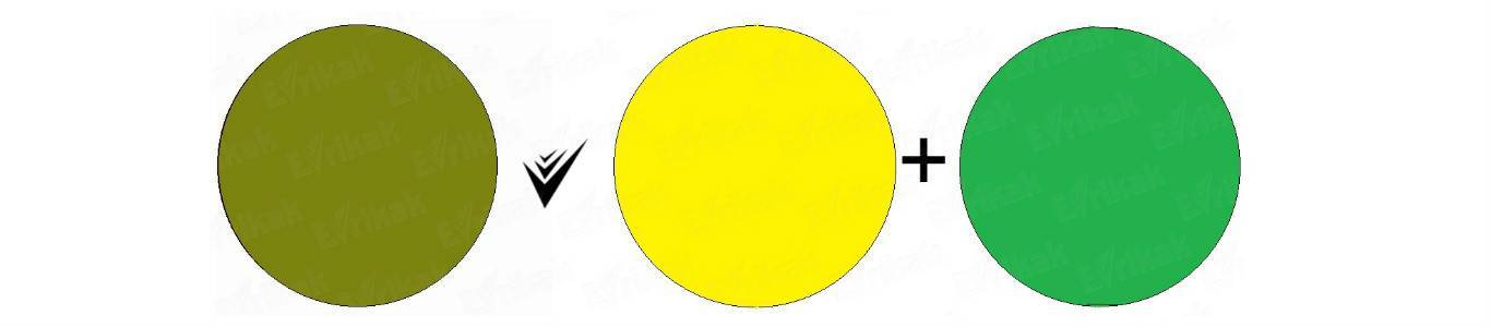 Соединение синего и желтого с небольшим добавлением коричневого представляет хаки. Зеленый с малым количеством желтого образует оливковый.