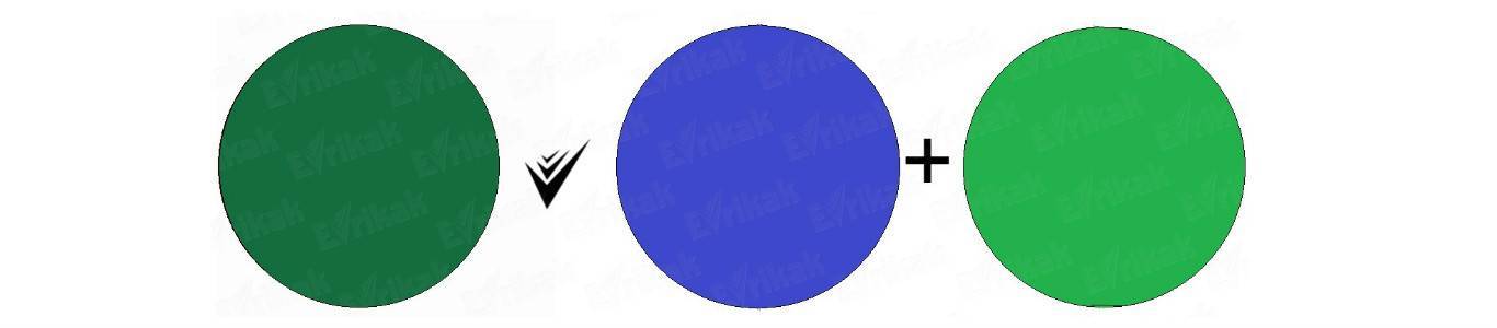 Смешение синей и зеленой краски. Изменять оттенки можно с помощью желтого тона;