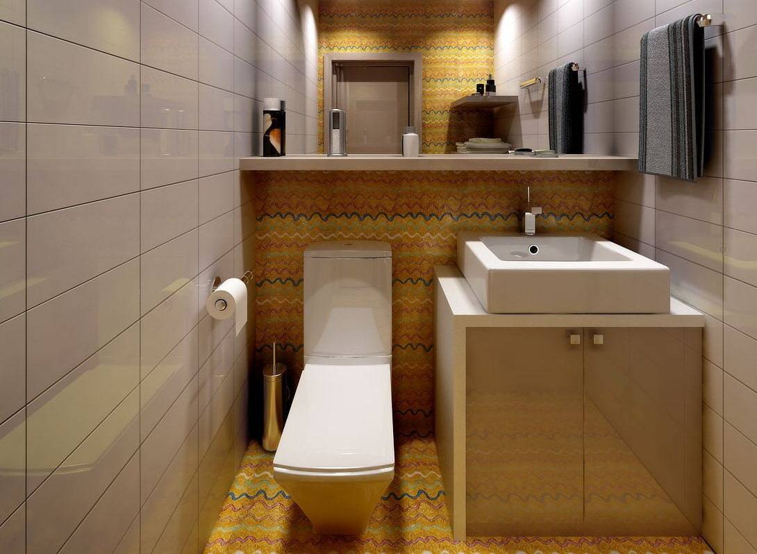 Основные акценты поможет подчеркнуть бежевый фон, это одно из лучших цветовых решений для ванной 6 кв. м. К оттенкам бежевого подойдет декор любого цвета.