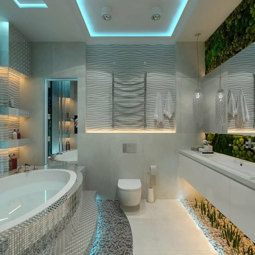 Дизайнерский стиль совмещенной ванной комнаты разнообразен. Если помещение просторное, можно выбрать: