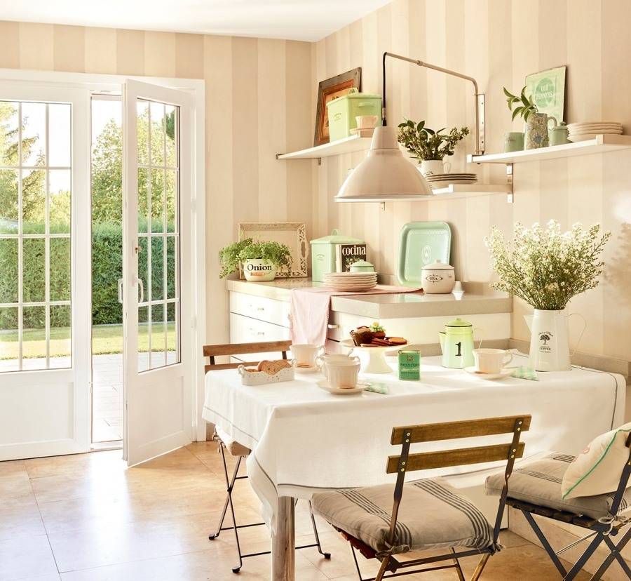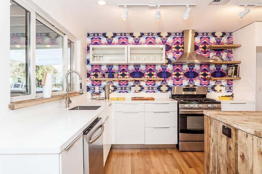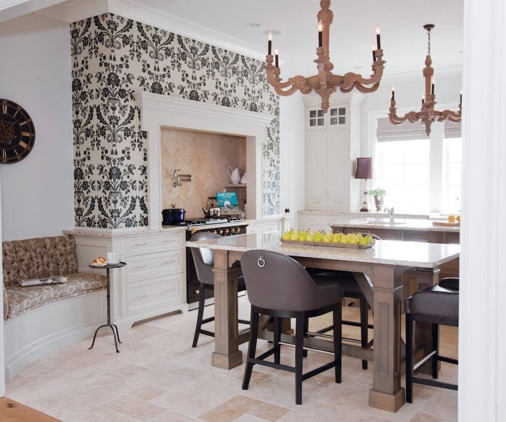 Обои на кухне — отличная идея. Вы можете применить их на всех стенах или в пространстве между шкафами. Посмотрите самое красивое расположение интерьеров кухонь с обоями.