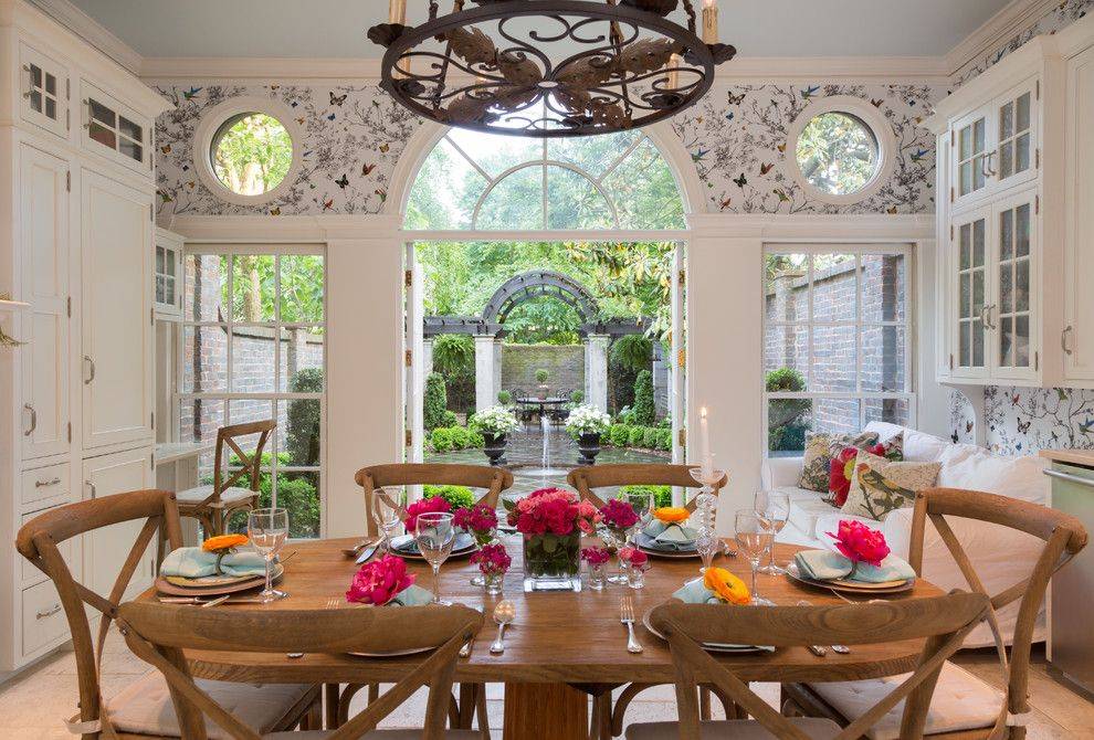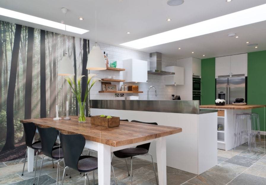 Обои будут интересным декоративным акцентом как на кухне, так и в столовой. Эти отделочные материалы позволяют создать оригинальную и интересную атмосферу, а также красиво оживить комнату. Вы можете наносить обои на всю стену или только на фрагмент. Такой отделочный материал также хорошо работает на столе для кухни. Если вас беспокоит долговечность таких обоев, то всегда можете покрыть мебель прозрачным стеклом.