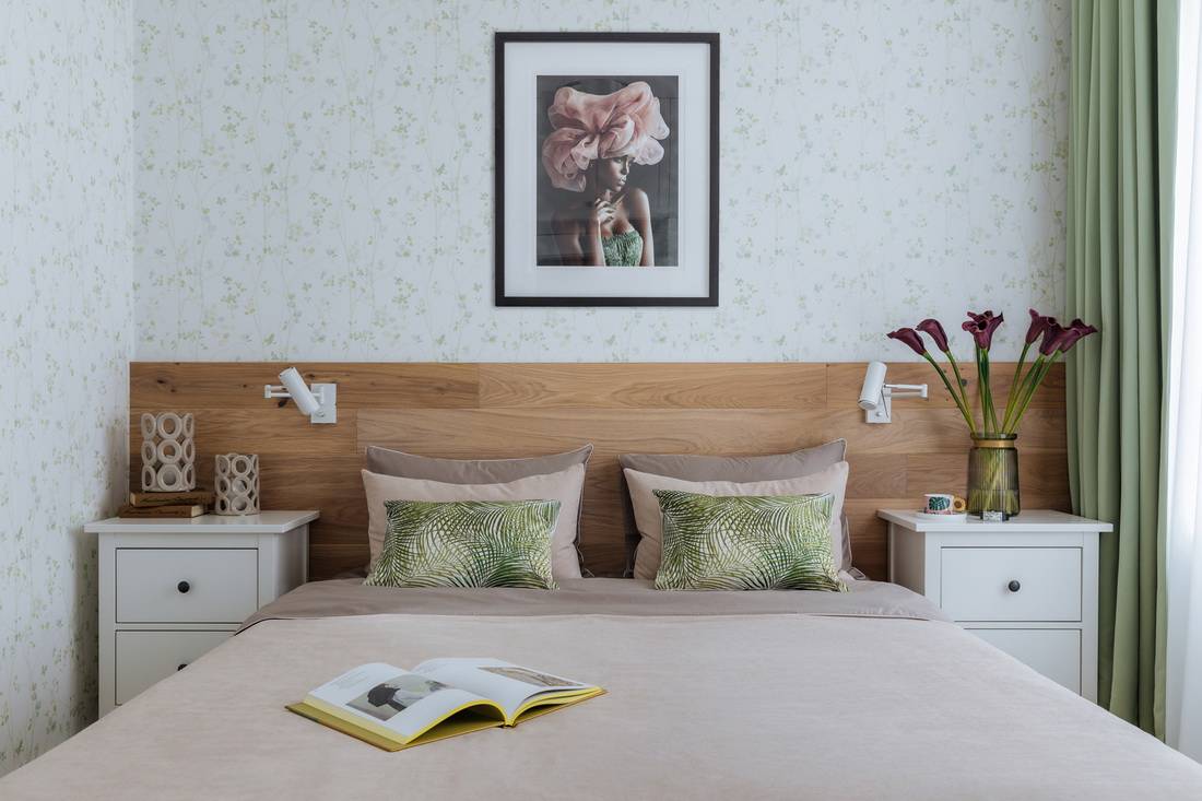Если обои с крупными узорами уменьшают площадь, то мелкие и не слишком яркие принты, наоборот, способны незначительно расширить пространство. Конечно же, не стоит задействовать такие композиции при оформлении всех стен в спальне, так как хаотичный рисунок может повлиять на качество сна. Но небольшие вставки с такими изображениями не только исправят пространство, но и добавят в дизайн динамичные акценты.
