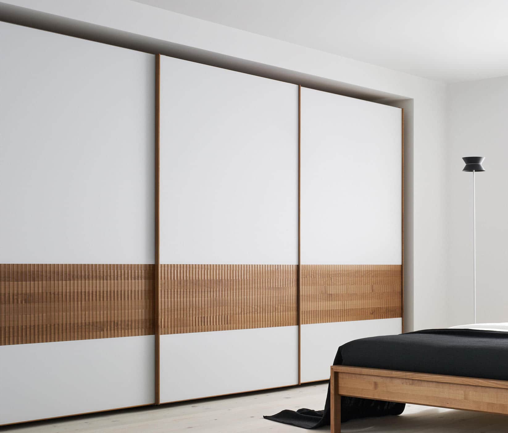 Сырье природного происхождения стоит дорого, поэтому редко используется в производстве шкафов-купе. Такие фасады роскошно выглядят, но массивны и непрактичны.