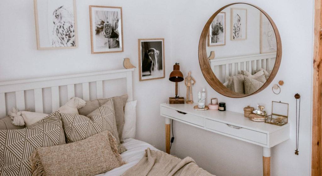 Во многих скандинавских спальнях поверхности стен оформляют в чисто белый цвет, без украшений, в этом случае и зеркало должно быть простым – без рамы.