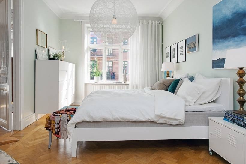 Нельзя сказать, что цвета для маленькой спальни должны быть спокойными и приглушенными, что является областью современного разнообразия скандинавского стиля. В интерьере, основа которого белый или серый цвета, можно смело использовать несколько разноцветных аксессуаров. Как пастельные, так и интенсивные оттенки будут соответствовать спальне, но их не должно быть слишком много.