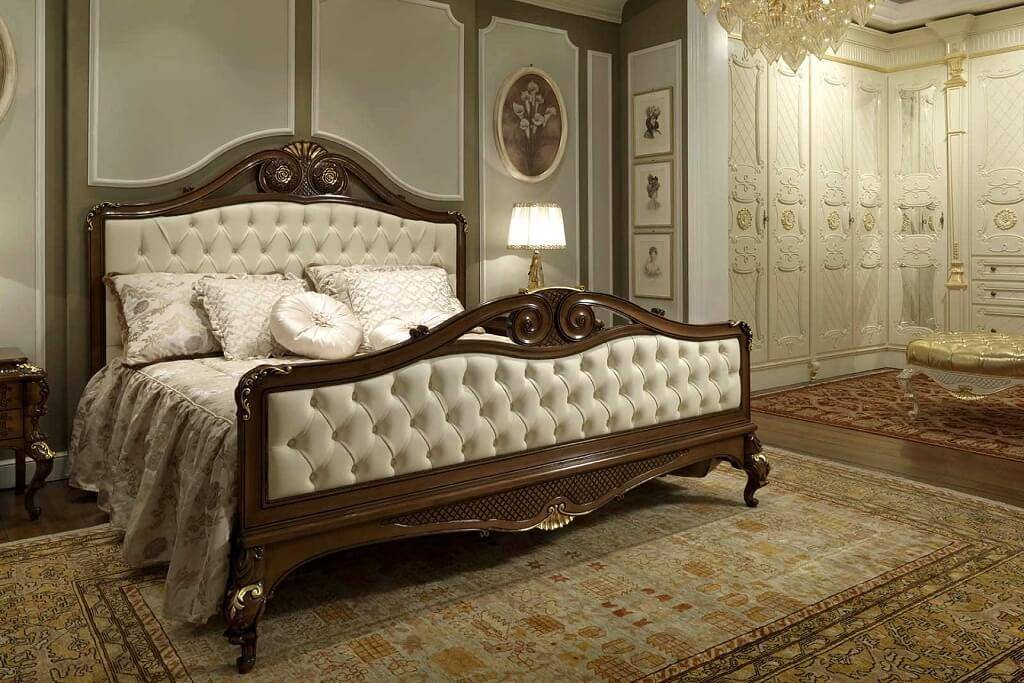 По бокам кровати симметрично располагаются прикроватные тумбочки. Их дизайн может отличаться от самой кровати, что создаст дополнительный акцент. В спальне не обойтись без туалетного столика и мягкого пуфа. Перед кроватью уместно поставить небольшую софу, сочетающуюся отделкой со спальным местом. Для просторной спальни необходимо купить платяной шкаф. Его фасады обязательно должны быть оформлены росписью, винтажными ручками, накладными декоративными планками.