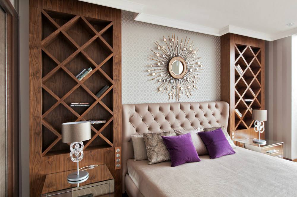 Производит впечатление прикроватная зона, в которой два шкафа по бокам спального места соединены над его изголовьем гипсокартонной конструкцией. Само изголовье при этом находится в образовавшейся нише. Остается красиво задекорировать пространство под нишей, например, выделить зону с помощью контрастных обоев с орнаментом и добавить источники света и уютный уголок готов.