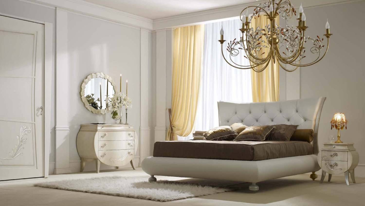Спальня в белых оттенках – классика стиля. Этот цвет используется во всем – в отделке, в предметах интерьера, в текстиле. «Разбавляют» дизайн аксессуарами других цветов или орнаментами, выполненными на фасадах мебели, поверхности стен и т.д.
