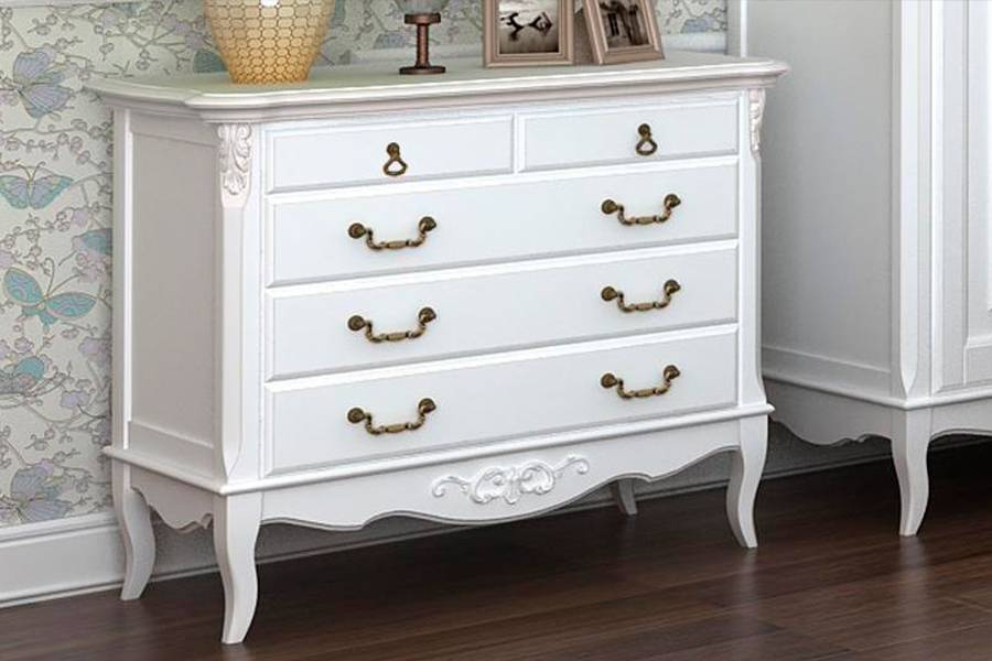 Шкаф в стиле прованс — массивный и высокий, его обязательно украшают резные фасады. Тумбочки и комоды обычно кованые или полностью деревянные, стоят на причудливых ножках.