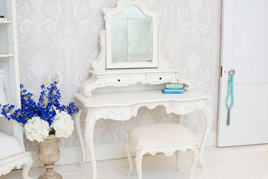 Для стола характерны высокие тонкие ножки из резной древесины или кованого металла, зеркало в изящной оправе.