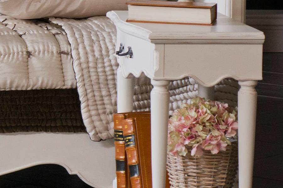 Возле кровати обязательно должны быть прикроватные тумбочки прованс. Желательно выбирать такие, которые будут сделаны из того же материала и в таком же цвете, что и кровать. На тумбочках можно разместить семейные фото в массивных белых рамках, торшеры, вазы с цветами или фарфоровые статуэтки для более уютной обстановки.