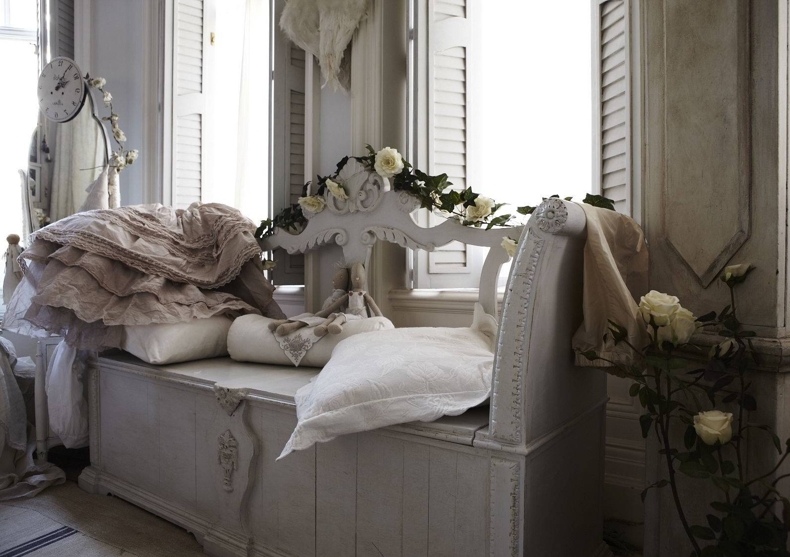 Постельное бельё предпочтительно однотонное, цвета слоновой кости, молочно-белого или сливочного. На нём великолепно смотрятся кружева ручной работы.