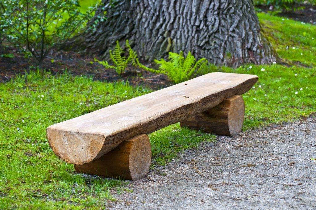 Для сиденья такой скамейки необходимо просто распилить бревно. Вторую часть бревна можно использовать для изготовления ножек скамьи. Эти детали соединяются между собой с помощью металлических штифтов.