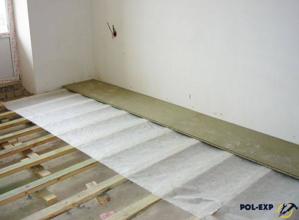 - можно дополнительно утеплить пол и сделать шумоизоляцию, уложив в пространство между лагами минеральную вату;