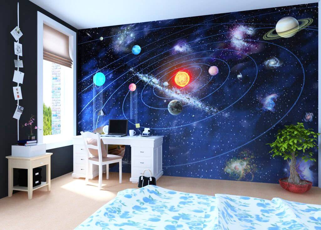 Для спальни подойдут звездное небо или облака, а также красивые цветочные поляны. Хорошо смотрятся водопады, зеленый или осенний лес – в общем, картины спокойной и красивой природы. Можно использовать графический рисунок или создать объемный ненавязчивый фон над кроватью, выделив зону сна.