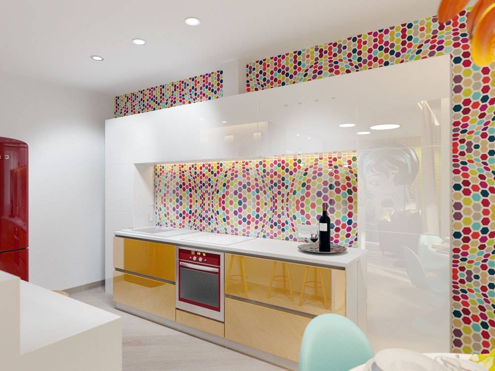 В интерьерном оформлении стен кухни смело используют яркие рисунки фруктов, овощей, различные натюрморты. Также уместными считаются пейзажи. Например, помещение в стиле прованс украсит стена с изображением фрагмента старинной улочки Парижа, а модерн дополнит стереоэффект современного мегаполиса.