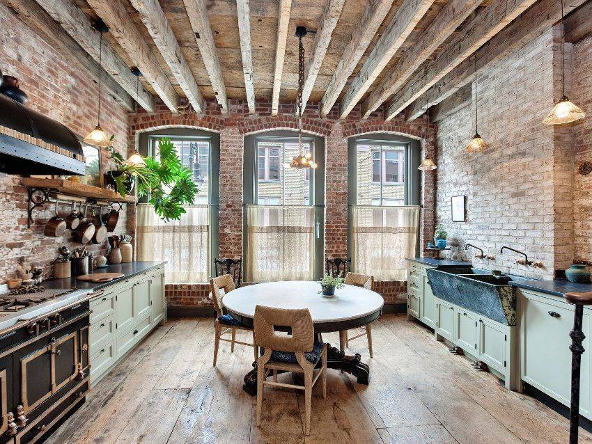 Оригинальность создаёт контраст между грубой отделкой помещения и современным оборудованием в кухне.