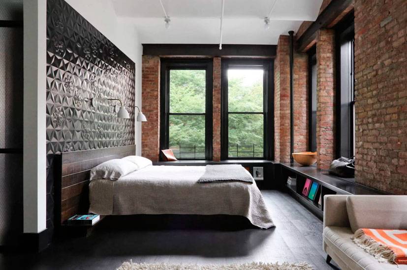 это часто встречающийся вариант, а вот для спальни в стиле лофт, лучше отвести отдельную комнату или отделить её зону с помощью ширмы или перегородки.