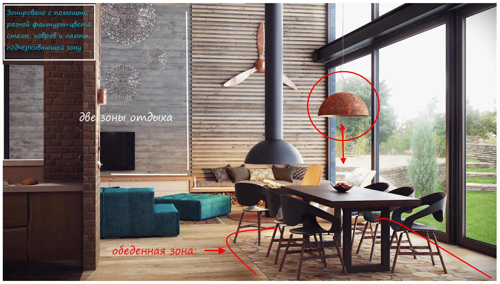 Комфортные условия в жилой комнате во многом зависят от освещения. При высоких потолках панорамные окна дают хороший свет днём, но в вечернее время требуется как яркий свет, так и приглушённый.