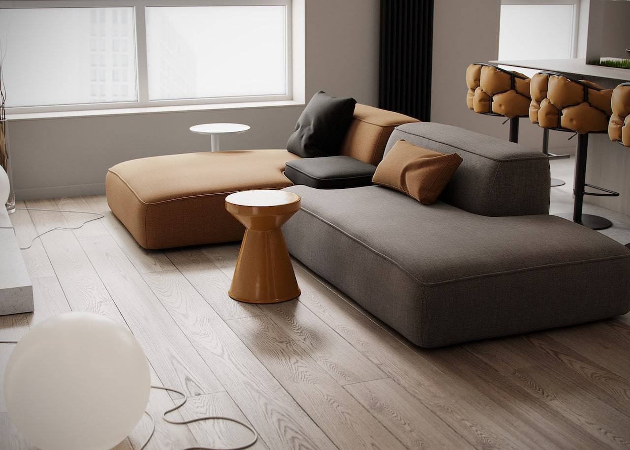 - С минимальным использованием аксессуаров. Обычно поверхности мебели, такие как тумбочки и журнальные столики, в основном голые.