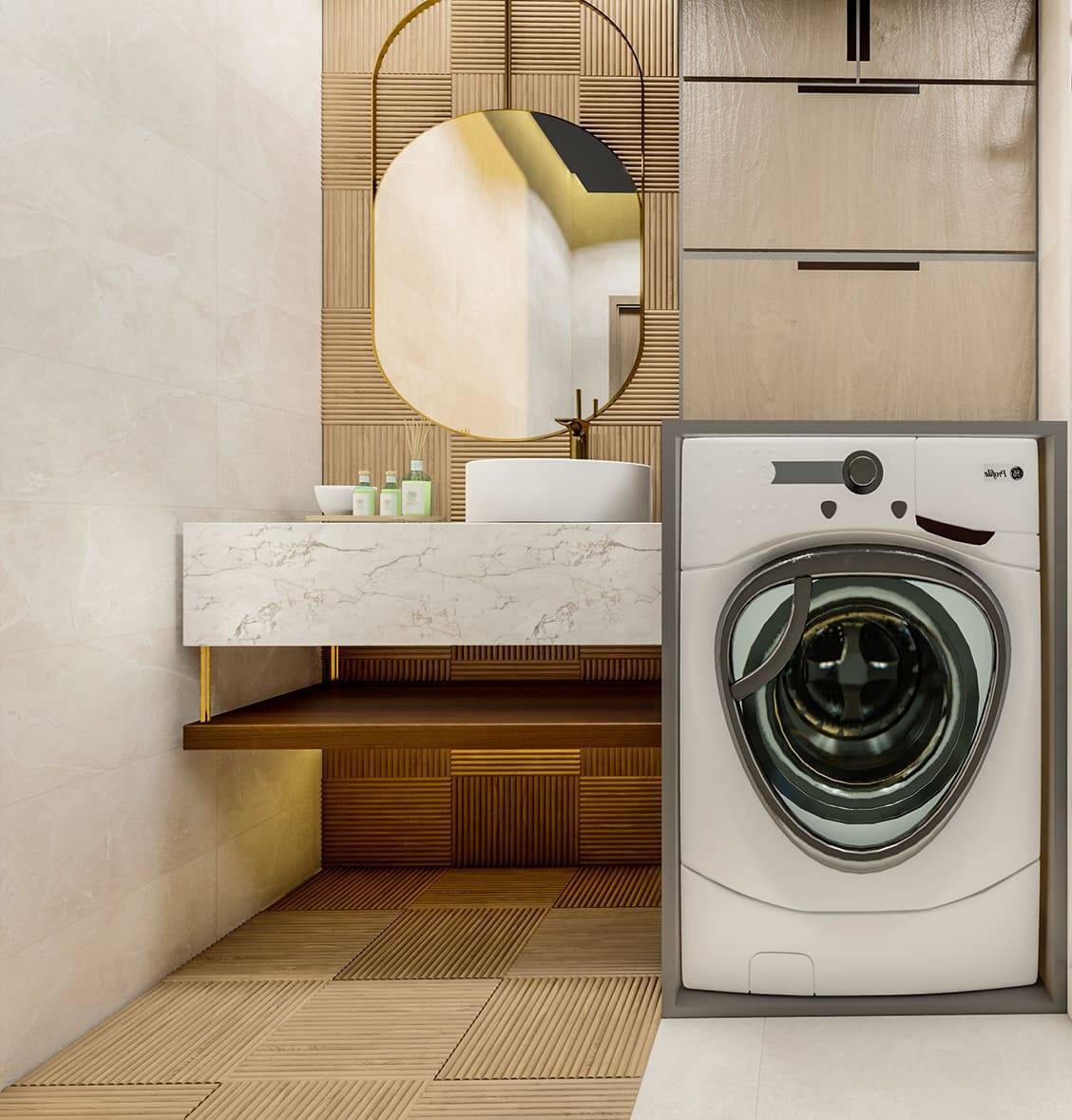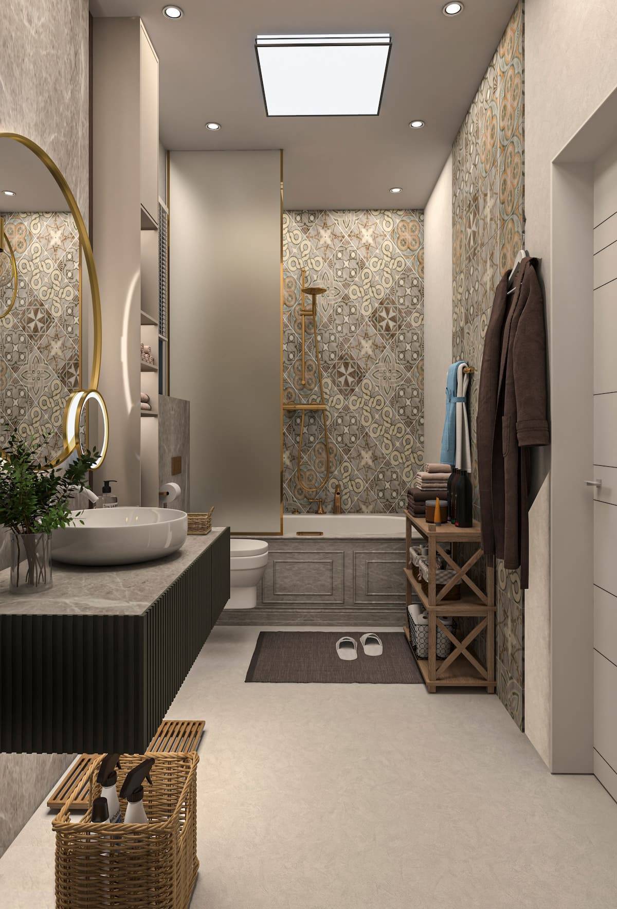 Благодаря таким проектам легко понять, что ванная должна быть не только эргономичной. Она должна быть устроена так, чтобы вам нравилось проводить в нем время, и каждое занятие напоминало расслабляющий спа-ритуал. Аура роскоши усиливается за счет использования золотых деталей.