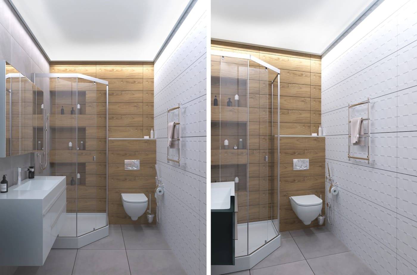 На стенах допускается легкая игра с текстурой и не слишком контрастный орнамент. Это актуально для маленьких ванных. Тонкая игра с геометрией позволяет визуально увеличить пространство.