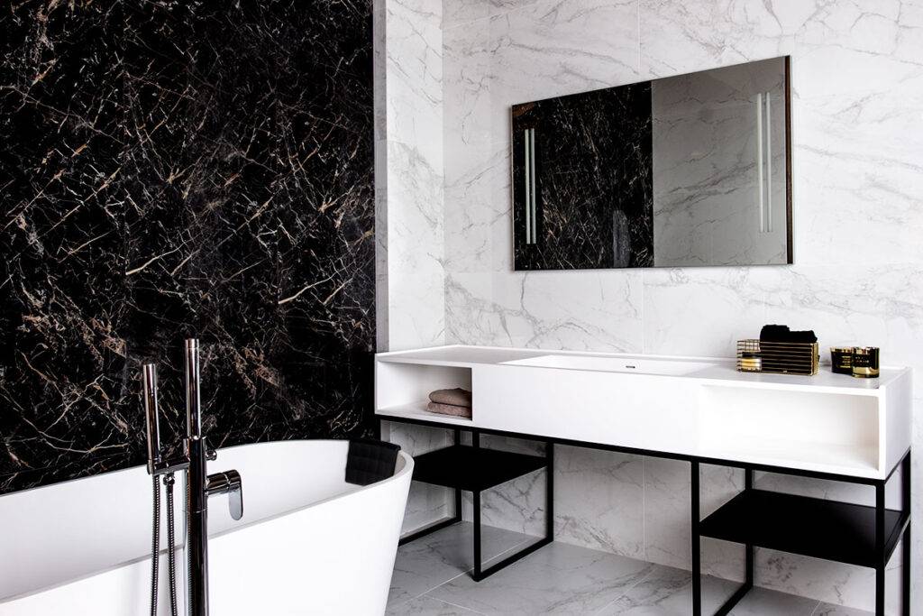 - сочетание черного и белого мрамора на поверхностях ванной комнаты не будет выглядеть скучным благодаря интересной структуре камня.