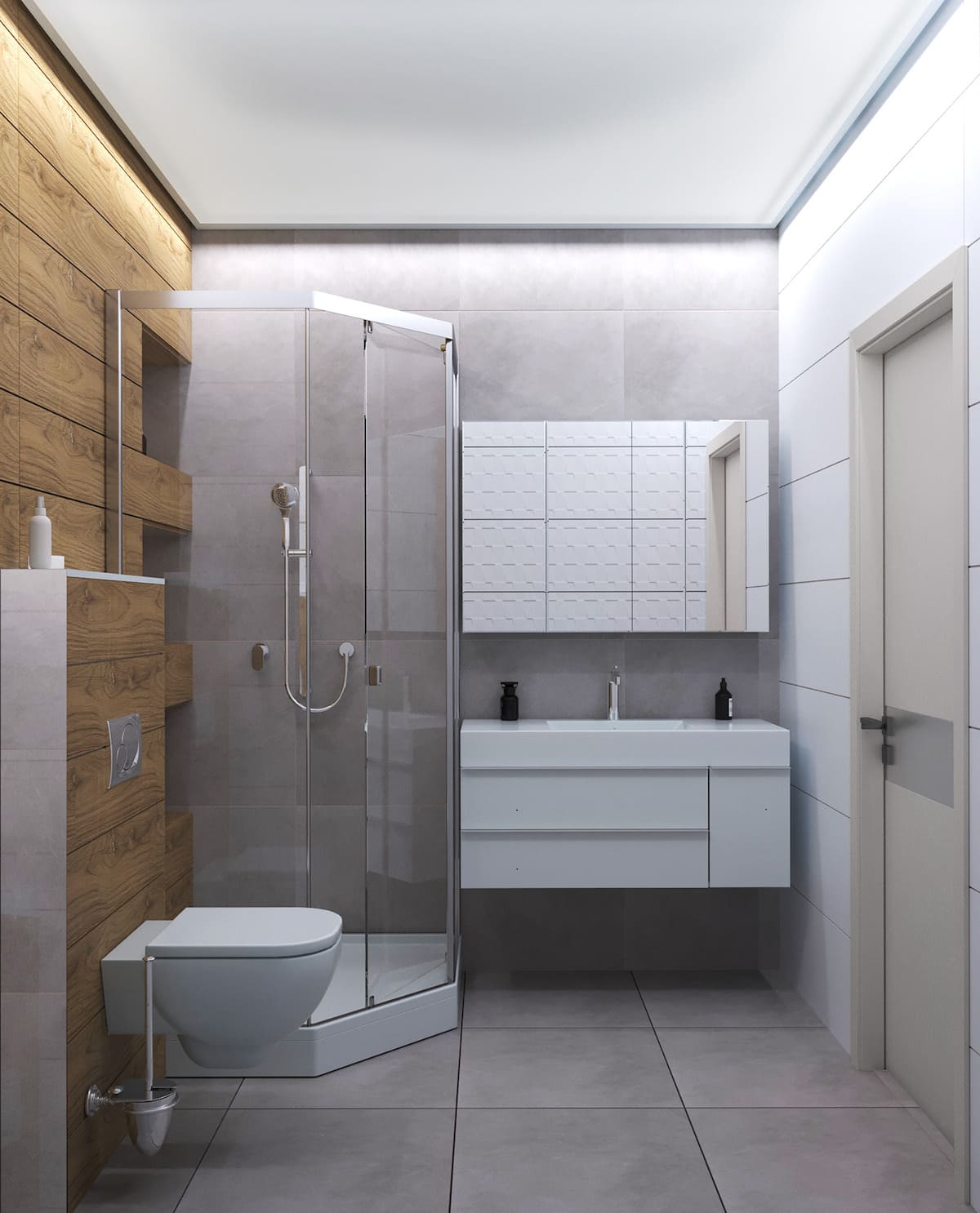 Расстояние от двери до соседней стены, необходимое, чтобы вписать в интерьер ванной кабину для душа, зависит от габаритов кабины.