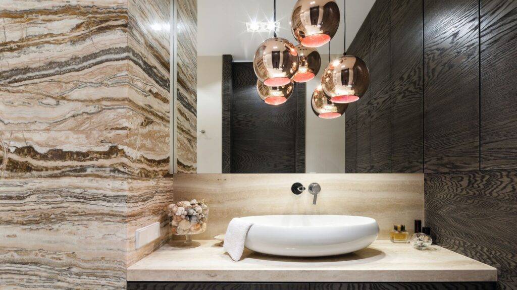 Поклонники этого стиля в интерьере предпочитают натуральные и элитные отделочные материалы. Мебель покупают из дорогой древесины, а для освещения применяют хрустальные люстры. Сантехнические изделия, такие как раковина и унитаз, изготавливаются из натурального камня или фарфора с росписью.