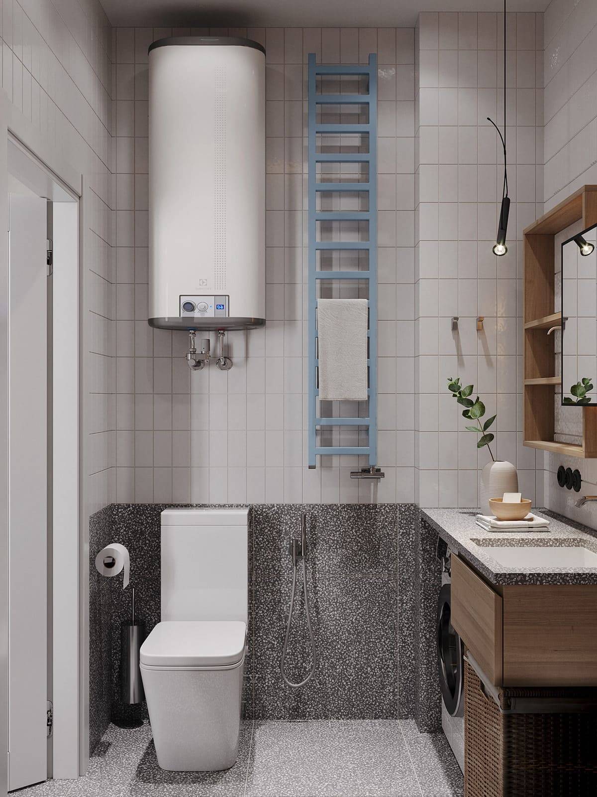 Выход один – объединить раздельный санузел, перенести коммуникации и тщательно выровнять стены, при этом спрятав в них хотя бы часть водопроводных труб.