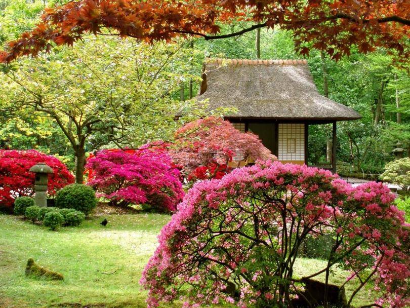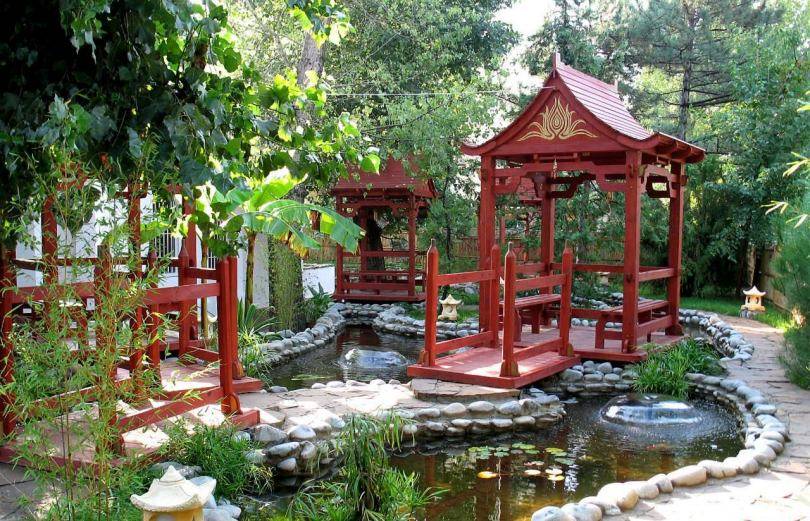 Как и в других стилевых направлениях не лишним будет сооружение некоторых водных компонентов, например, фонтанчик, ручеек или водопад. В некоторых случаях для достижения завершенности и максимального соответствия выбранному стилю рекомендуется постройка беседки, желательно там, где много деревьев. Ее можно украсить вазонами с цветами и предусмотреть тропинку, ведущую к водному объекту.