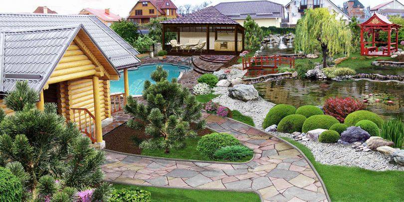 Это может быть место для отдыха (терраса или беседка), дорожки и клумбы, детская площадка, бассейн или декоративный пруд. Объединить все детали в единое целое поможет ландшафтный стиль.
