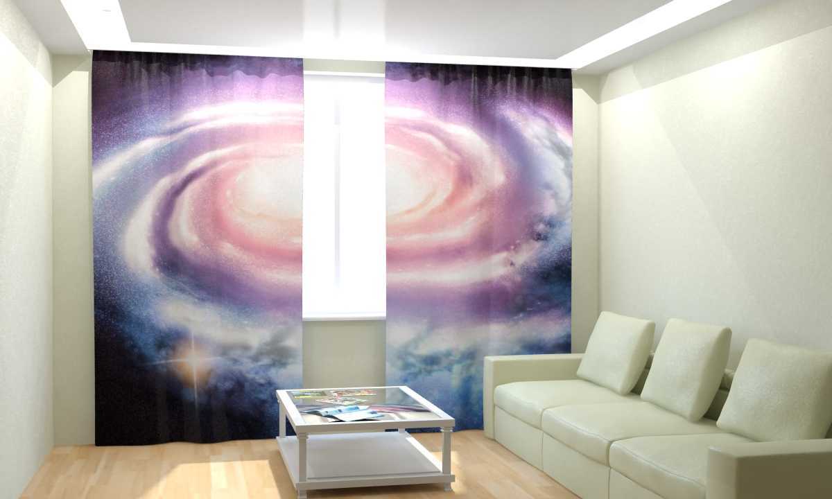 Не стоит на ограниченной квадратуре обращаться к объёмным узорам и горизонтальным полоскам. Если вешаются фотошторы, то они должны иметь глубокую перспективу, уходящую вдаль с изображением лесной тропы, аллеи, открытого окна.
