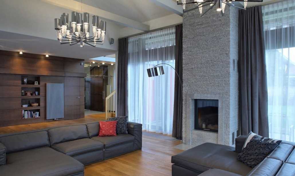 Цвета материала и мебели, вид освещения выбирают по вкусу и особенностям помещения, чтобы создать технологичные элементы и стильную, но неизменно удобную обстановку. Интересен вариант со стеной из камня, выделяя таким образом определенную акцентную зону и добавляя стиль в интерьер.