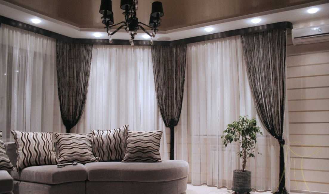 Они отлично смотрятся в эркере, неплохо будут выглядеть на панорамном окне. Драпировку можно сделать вверху, а также не только на гардинах, но и на портьерах.