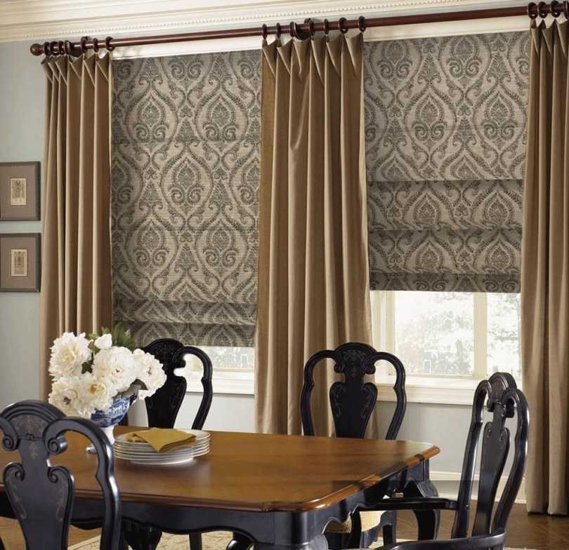 Самое модное сегодня сочетание ― римские шторы и портьеры, сшитые из одинаковой однотонной ткани приглушенных природных цветов: оливкового, сливового, вишневого, кофейного.