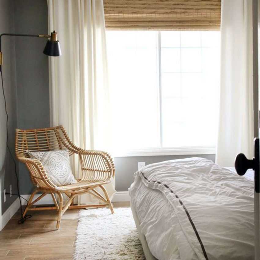 Занавеси из натуральных материалов, таких как лен, хлопок, бамбук привнесут в спальню ощущение легкости и единения с природой.