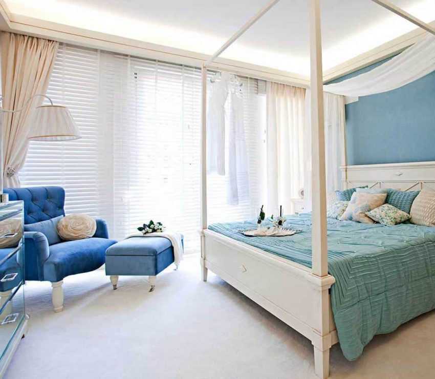 Для того чтобы увеличить площадь визуально, стоит рассматривать только светлые ткани или прозрачные шторы для маленькой спальни.
