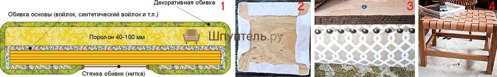 Сидеть долго на жестком табурете неудобно, поэтому что-то помягче придется тут впору. Как устроено мягкое сиденье табурета, показано на поз. 1 рис. Нужно сразу заметить, что внешнюю обивку лучше делать из мешковины, и сшить для табуреток накидки из декоративной мебельной ткани. Табуретом пользуются интенсивно, нередко небрежно, и дорогой жаккард и т.п. на нем скоро замаслится. А накидку можно постирать, и сшить ее куда проще, чем чехол на стул или кресло.